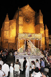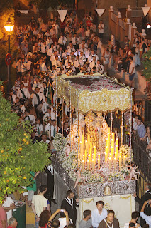 A las 21´00 horas el cortejo se ponía en la calle para ver las calles convertidas en un mar de fieles y de pétalos de flores ofrecidos desde balcones. El gentío llenaba la Cuesta como un Jueves Santo, que no dejó a la Señora del Escapulario en las estrechas calles de Moriscos, López Criado o Rejas de Don Gome. Vivas, palmas y flores para su Virgen del Carmen, que aparecía ante todos con la Sublime Belleza en su plenitud.